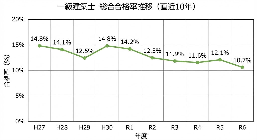 一級建築士試験のストレート合格率(総合合格率)の推移は以下のとおりです。